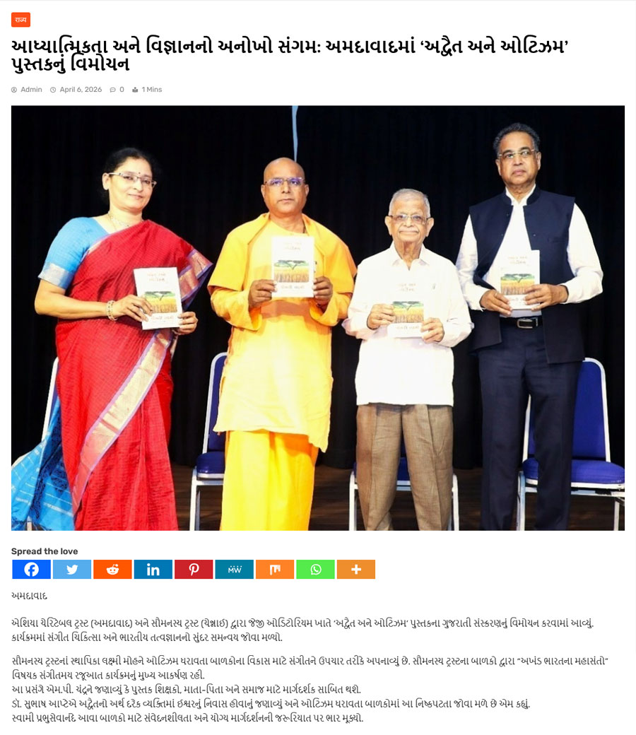 | આધ્યાત્મિકતા અને વિજ્ઞાનનો અનોખો સંગમ: અમદાવાદમાં ‘અદ્વૈત અને ઓટિઝમ’ પુસ્તકનું વિમોચન | |