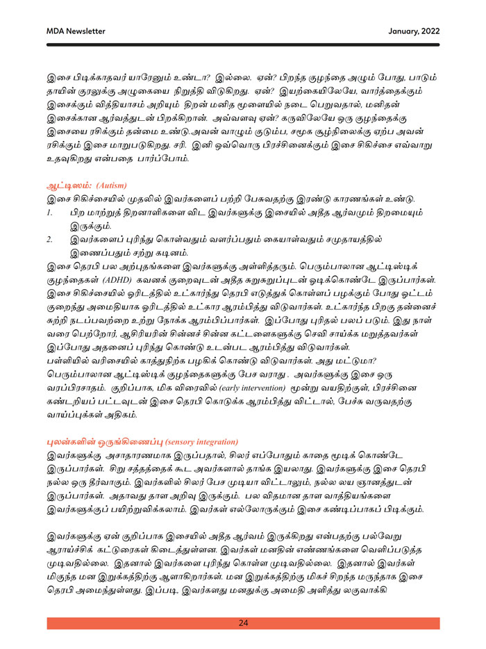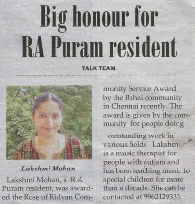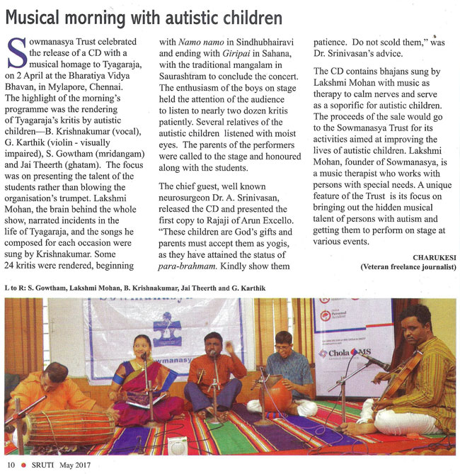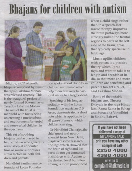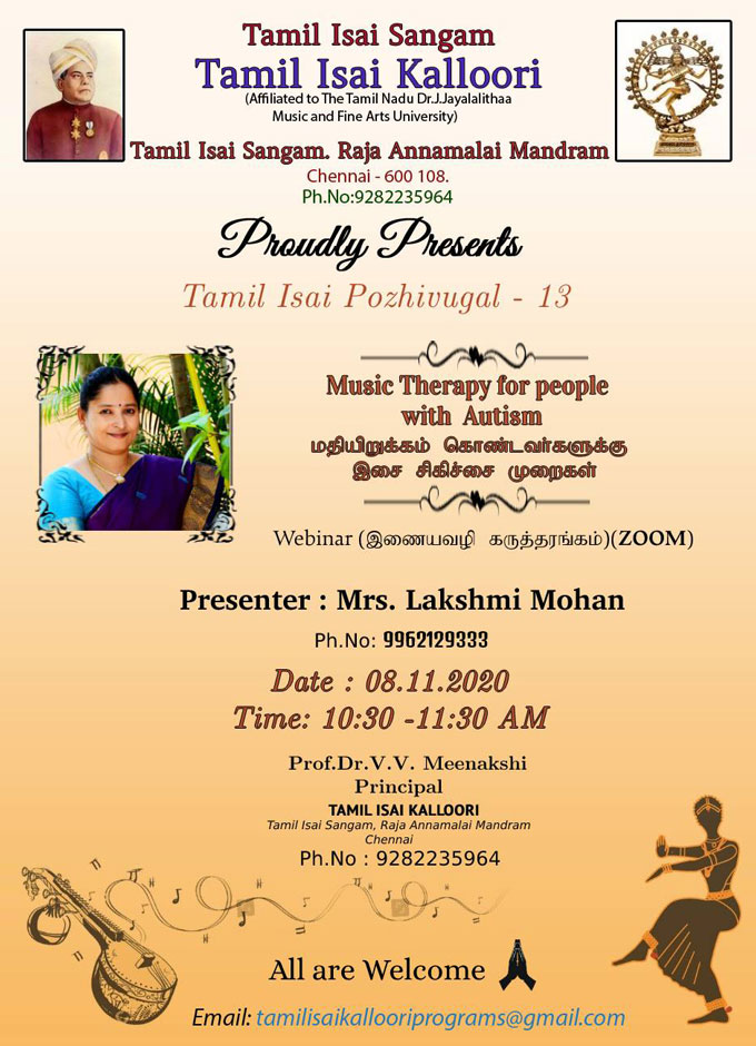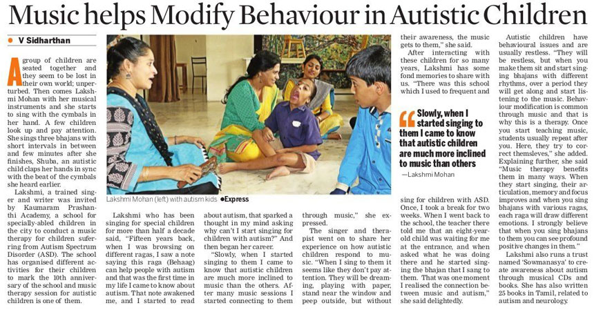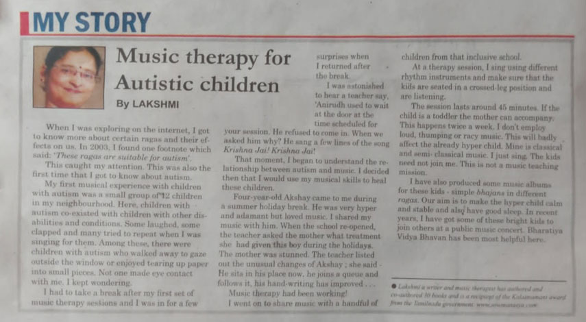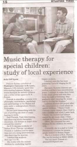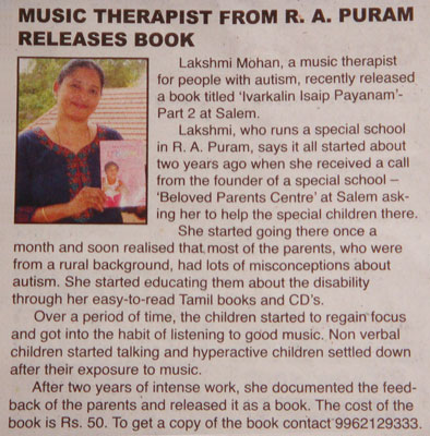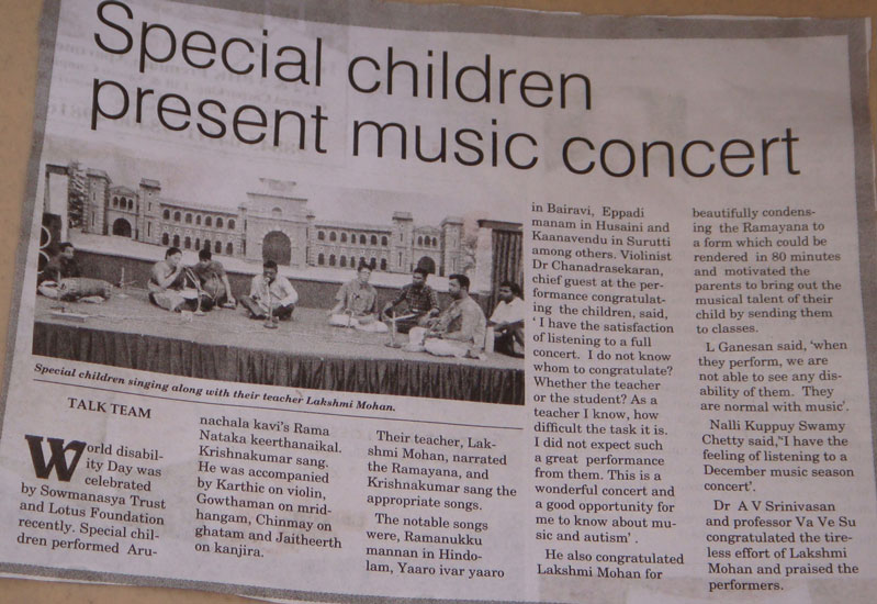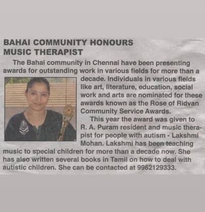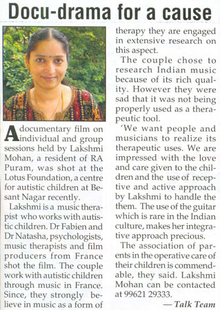| A workshop on Music Therapy for people with Autism in a big institution "Koumaram Prashanthi Acadamy" at Coimbatore | |