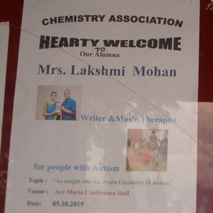 | Last week, I was invited for a guest lecture to my college. I entered after 23 years. It was a wonderful experience for me. Since, I am a chemistry graduate, I gave a lecture on "An insight into the brain chemistry of Autism". | |