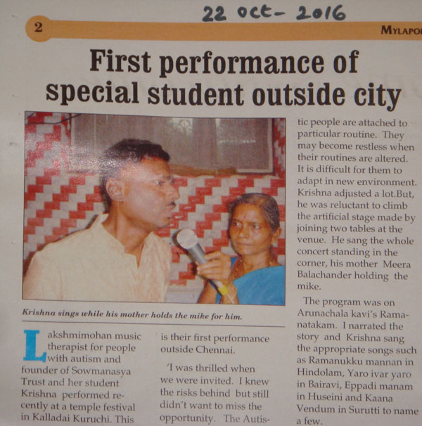 | My student Krishna performed a wonderful concert at Kallidaikurichi on 31/8/2016. We visited Amar Seva Sangam at Ayakkudi. It was a wonderful experience for me. |