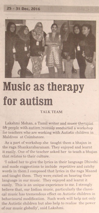 | On 2nd of December 2016, I conducted workshop on Music therapy for Autism for therapist from Maldives. It was an unique experience. I composed and taught a bhajan in their language (Divehi) They were so....exited. and me too:) |
