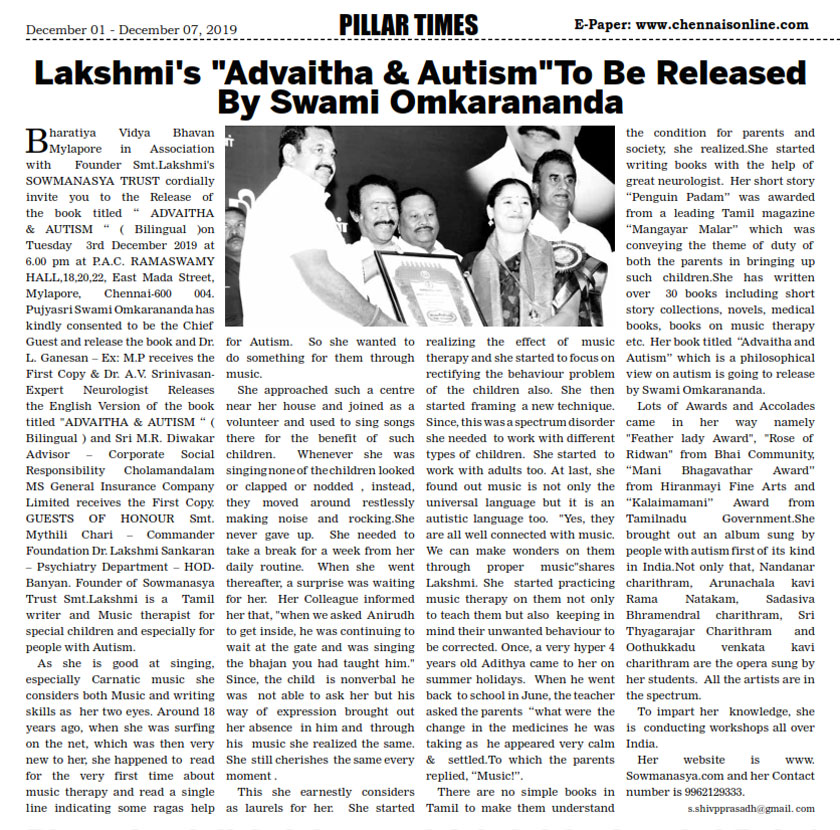 | Lakshmi's "Advaitha & Autism" To Be Released By Swami Omkarananda |
