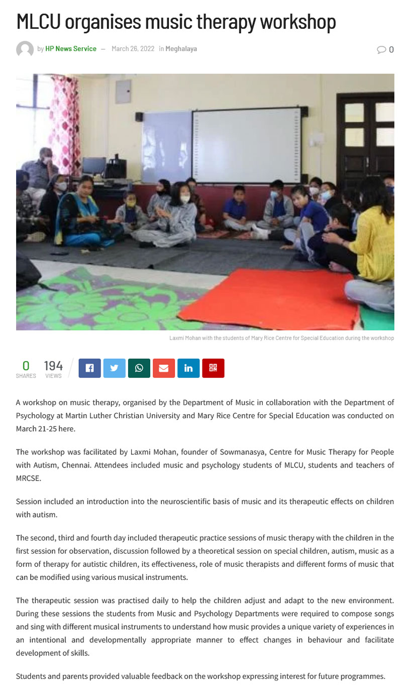 | Workshop on Music therapy for people with Autism, for music department from Martin Luther King Christian University - Shillong, Meghalaya. |